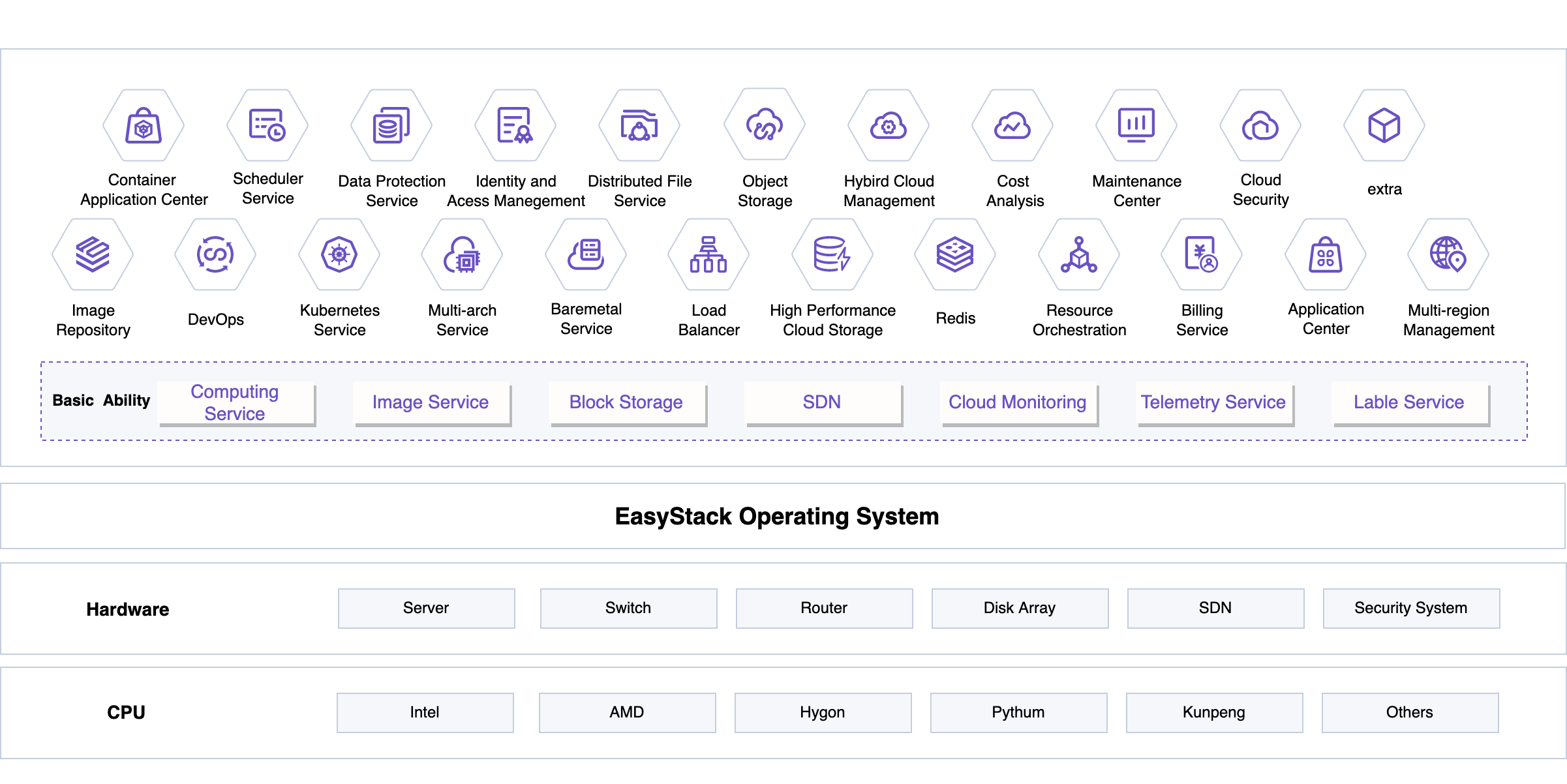 Users can build a new cloud data center with heterogeneous, diverse and support on multiple chipsets with EasyStack cloud infrastructure. The digital native engine EOS manages hardware abstraction, is compatible with mainstream chipsets, supports multiple chipsets coexistence, and helps enterprises realize full stack security from the chipset to higher level of business systems application.